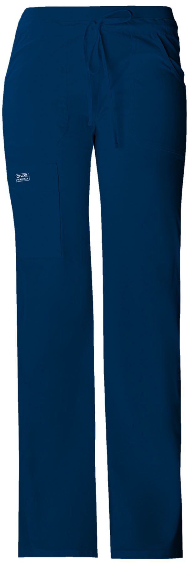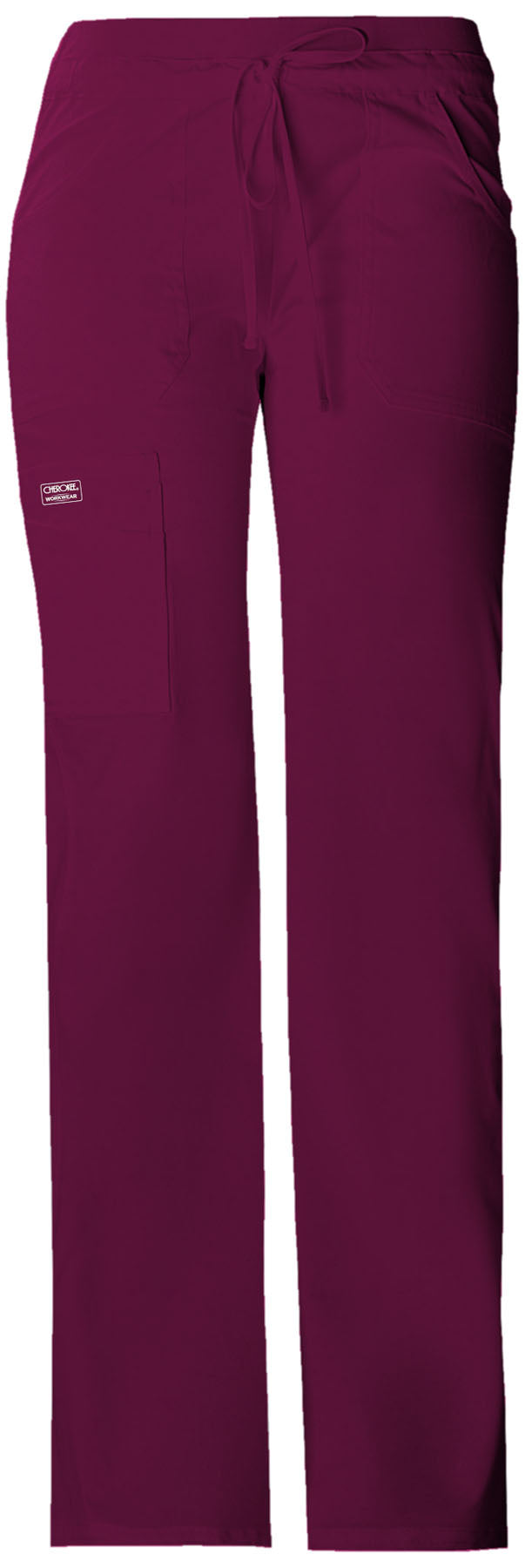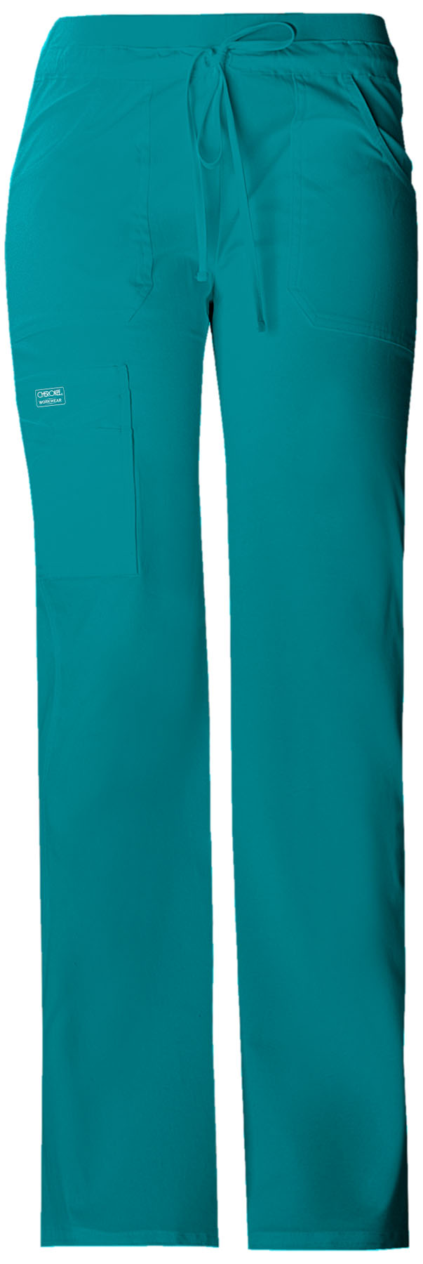 A Contemporary fit low rise, flare leg pant features a knit waistband with encased elastic and an adjustable drawstring. Also featured are patch pockets, a sectional cargo pocket, two back patch pockets, a back leg seam, double needle topstitching, and side vents. Inseam: 34"