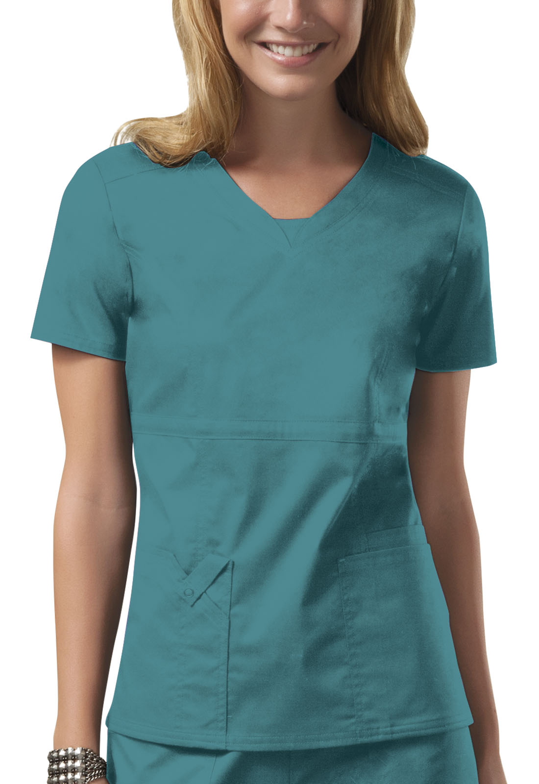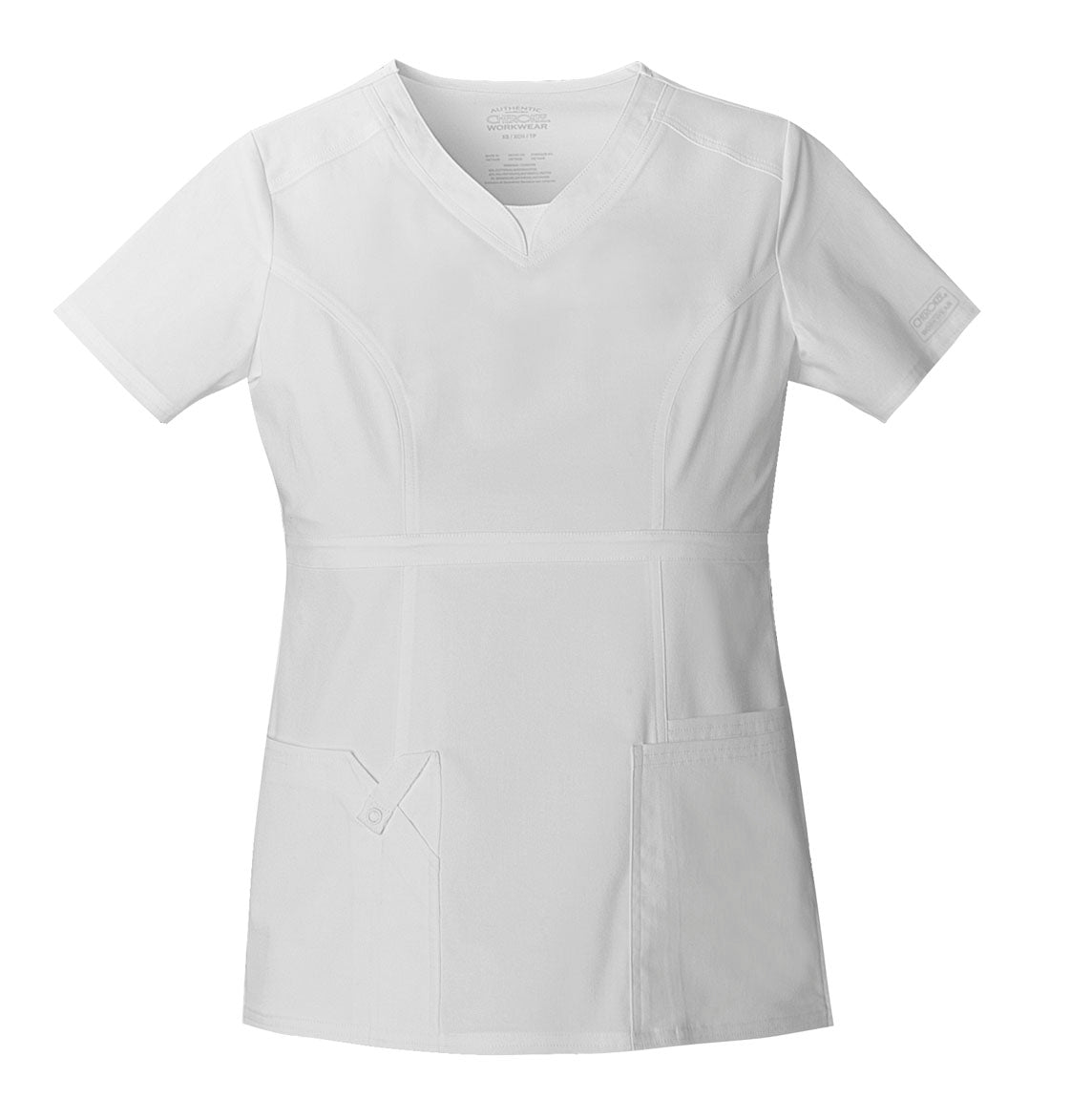 A Contemporary fit empire waist top features rounded V-neckband with a dickey inset, front shoulder yokes plus front and back princess seams. It also features two patch pockets: wearer's left has additional roomy cell phone pocket and wearer's right has pen slot with twill tape loop and functional snap. Double needle topstitching and side vents complete this fun, youthful top. Center back length: 25"