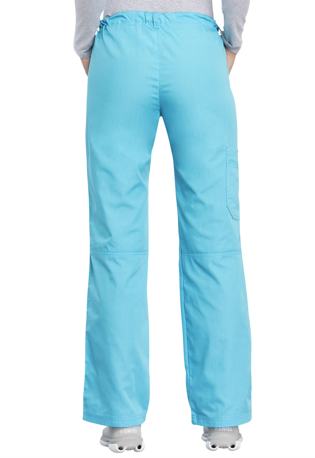 A Modern Classic fit, low rise, straight leg, drawstring pant with an elastic waist features, two front pockets, a D-ring on the left pocket, one cargo pocket with one scissor pocket, leg seaming detail at the knee, five belt loops and double needle top stitching complete this extraordinary pant. Inseam 28 1/2"