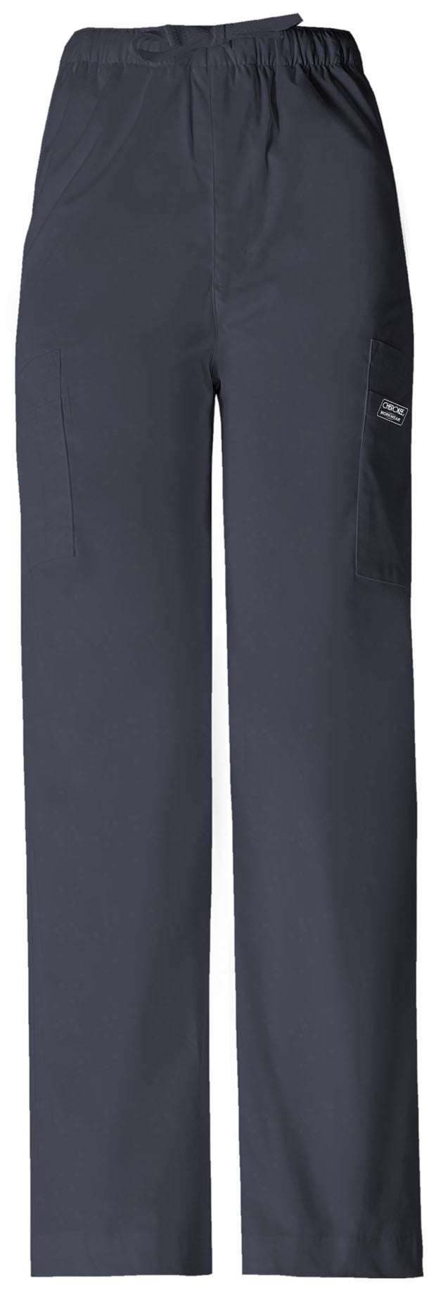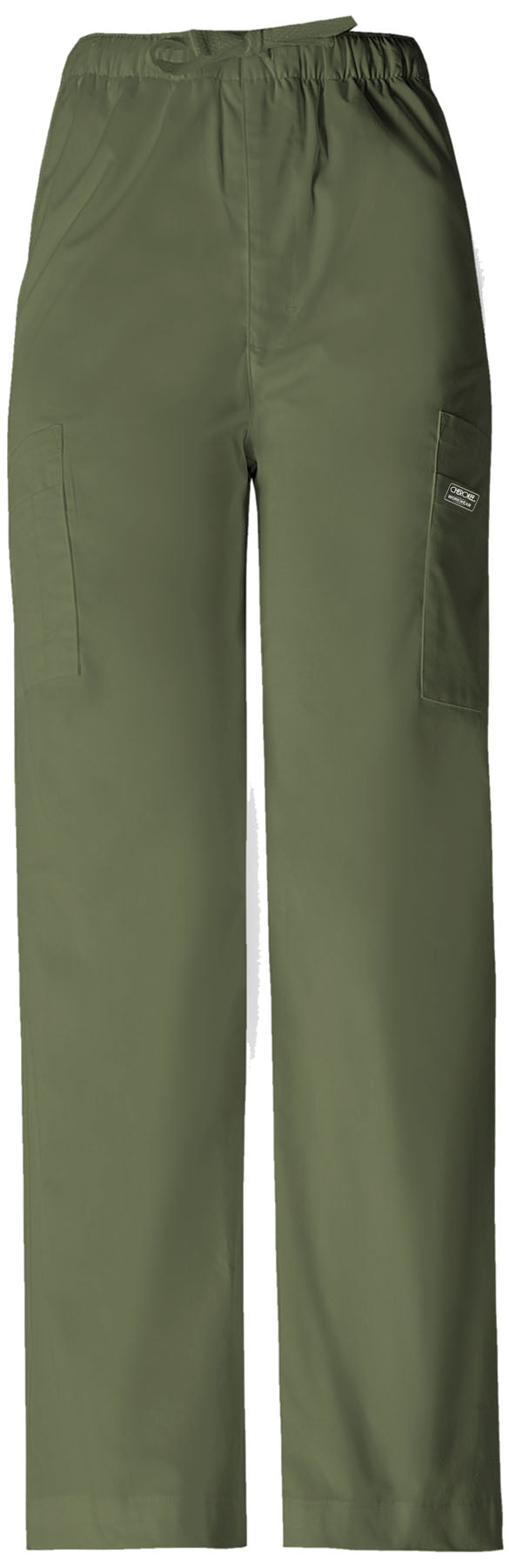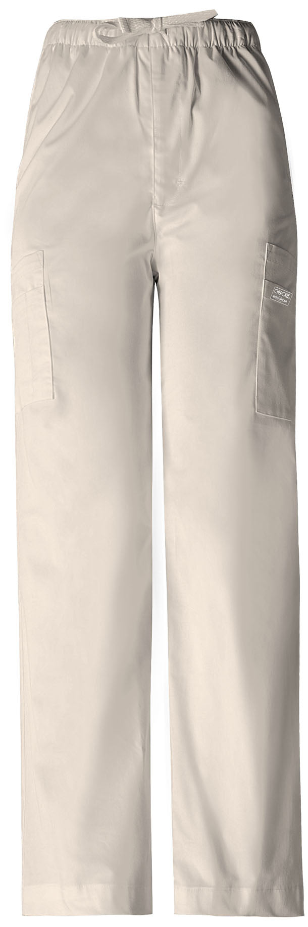 A Men's natural rise elastic waist pant features a reinforced adjustable drawstring, a functional zip fly, two slash pockets, four side cargo pockets, and a back patch pocket with button closure for added security. Inseam 31".