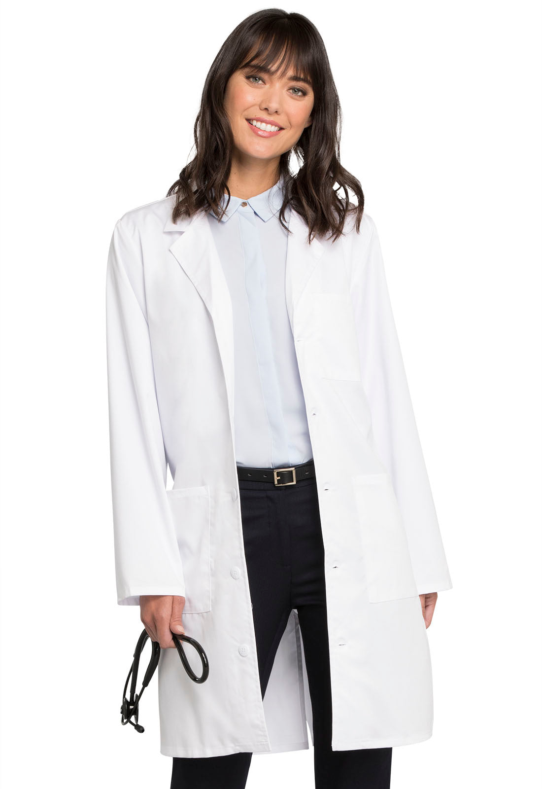 A Unisex fit, button front lab coat features a notched lapel, a chest pocket, and two lower patch pockets with side entry for easy access to pant pockets. A back yoke and kick pleat complete this coat. Center back length: 38"