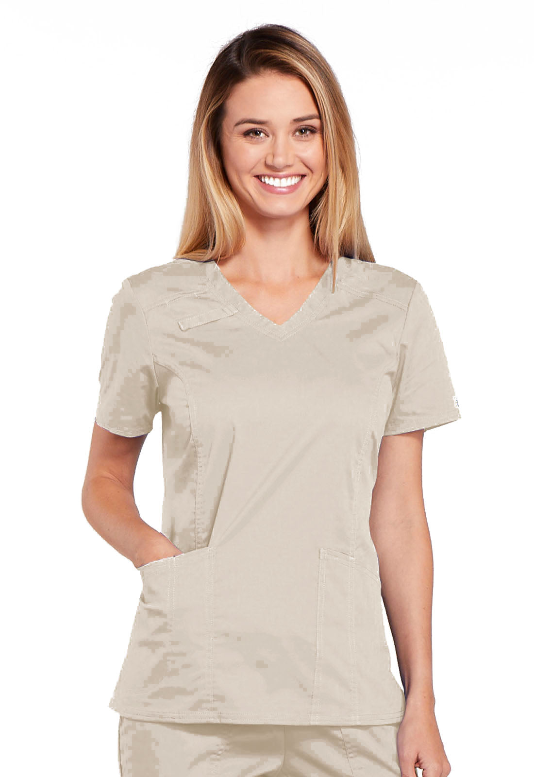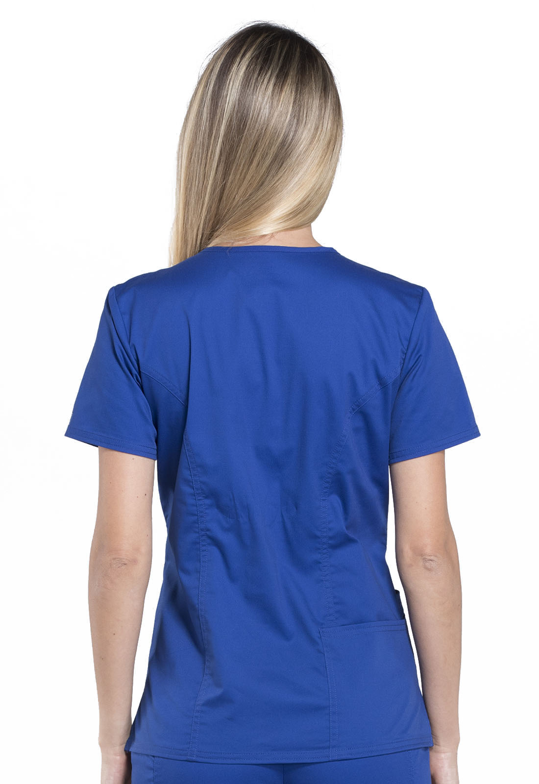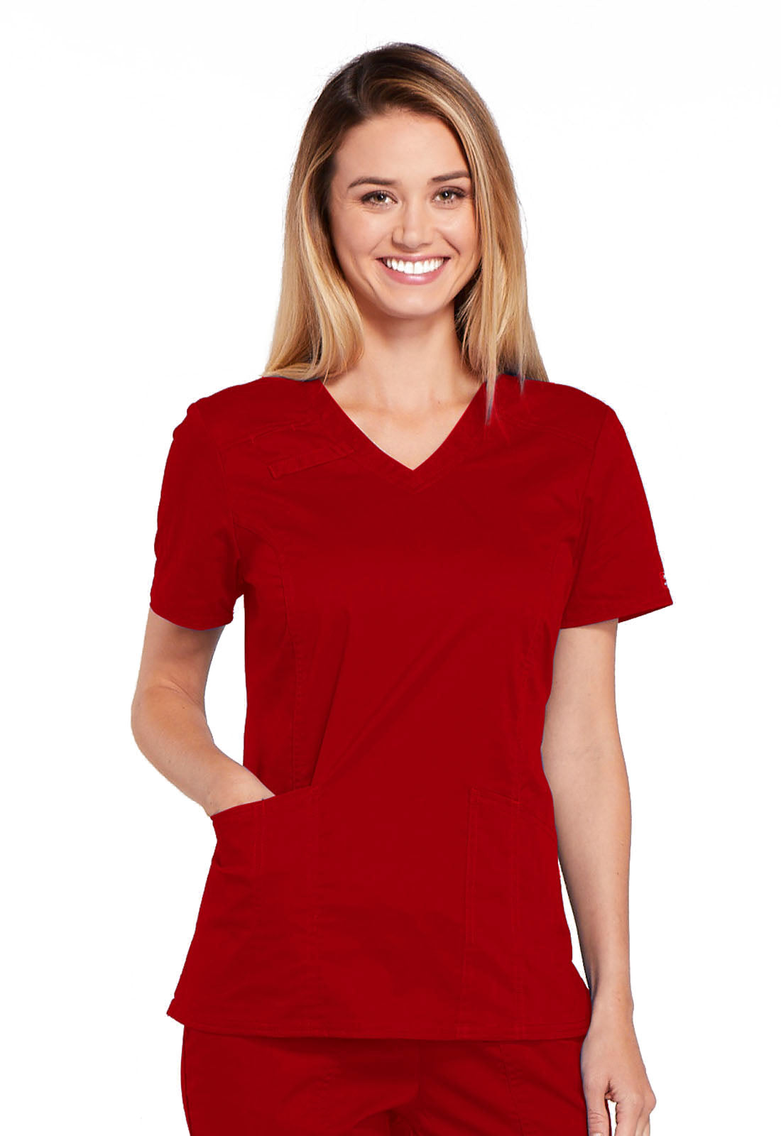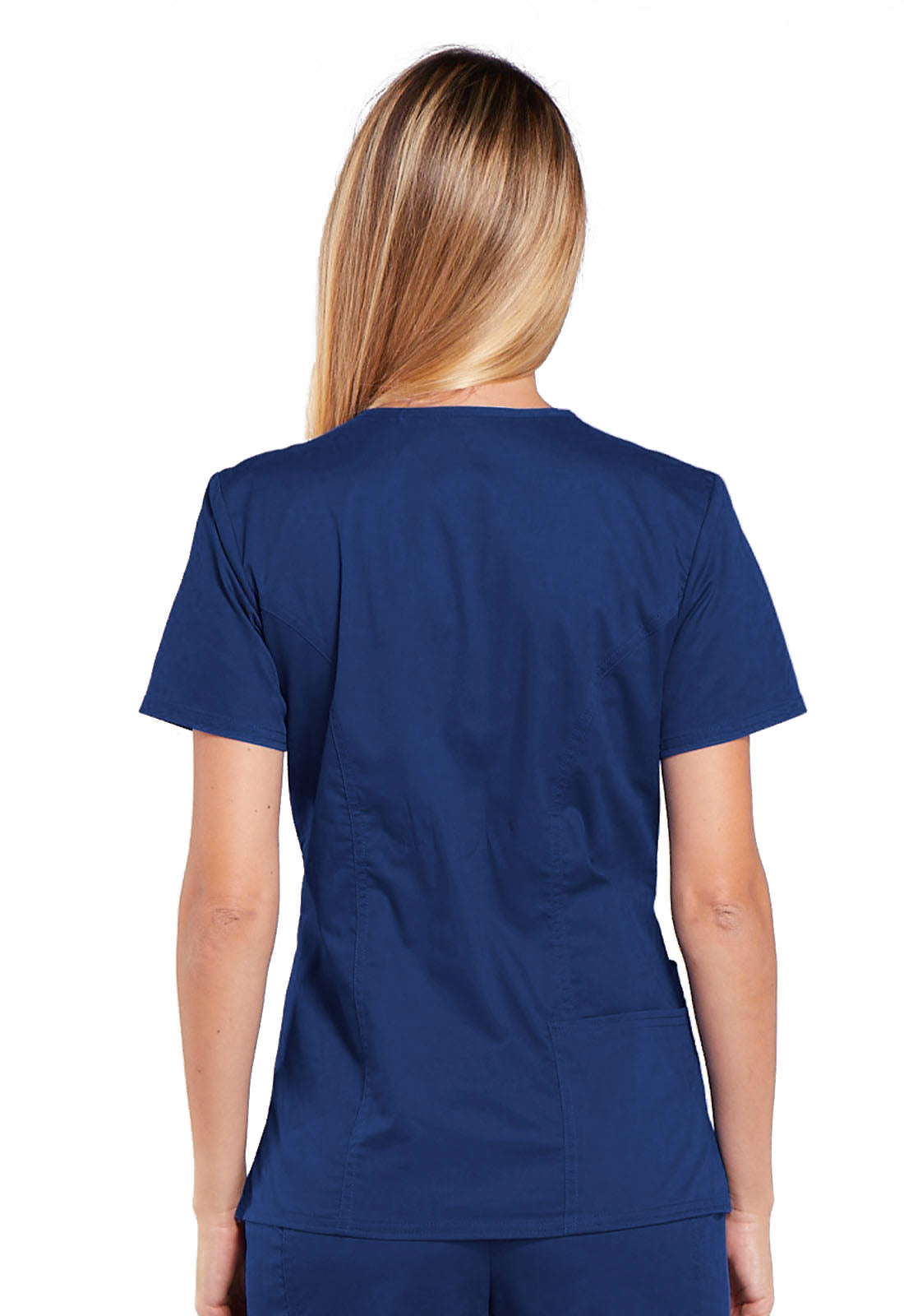 A Modern Classic fit V-neck top features front shoulder yokes with an I.D. badge slot, a stethoscope loop, patch pockets, an interior pocket, a pen slot and a back pocket. Also featured are front and back princess seams, side vents and double needle topstitching. Center back length: 26"