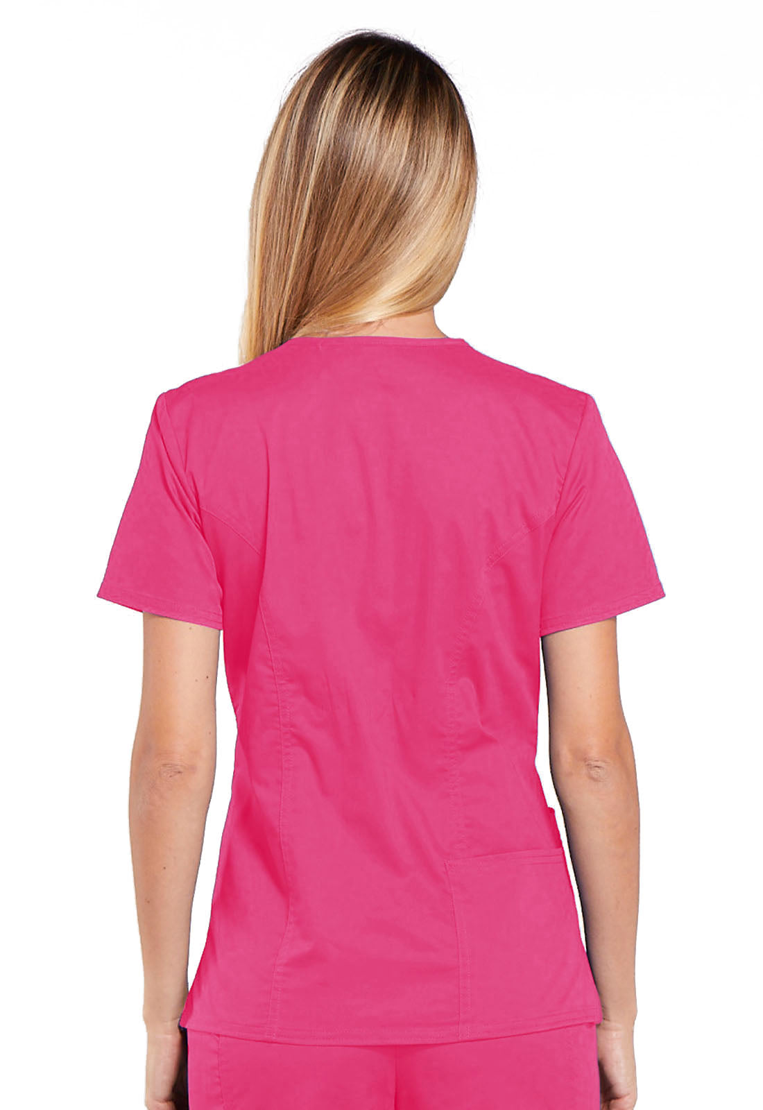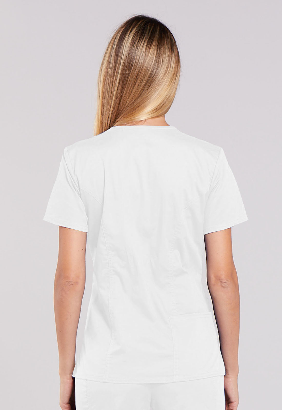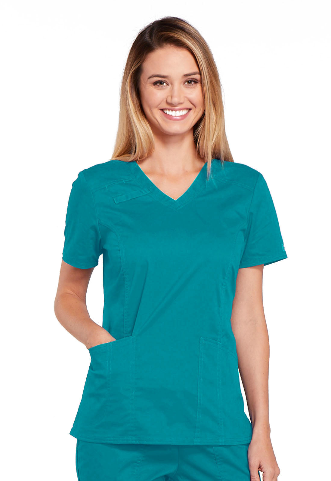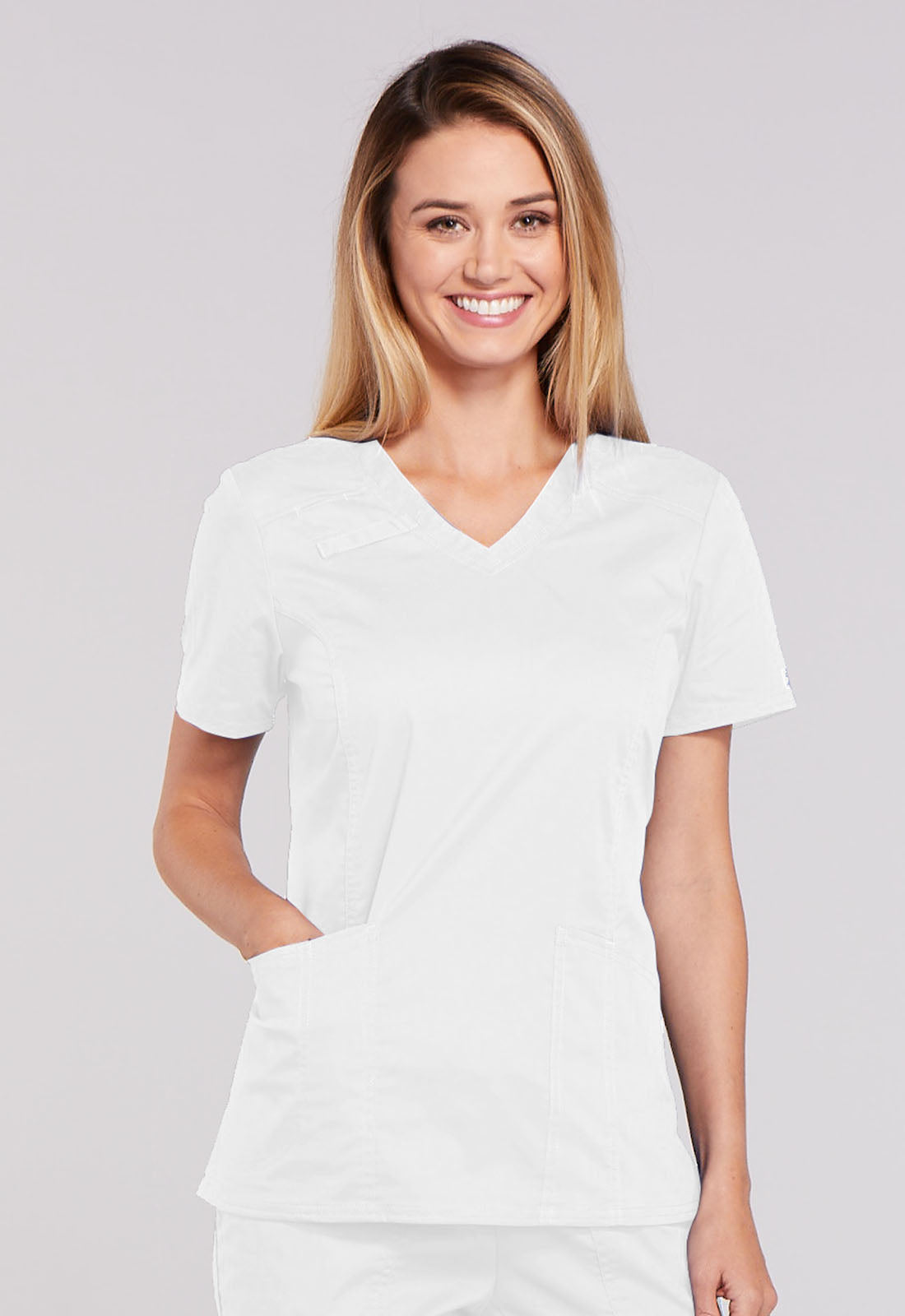 A Modern Classic fit V-neck top features front shoulder yokes with an I.D. badge slot, a stethoscope loop, patch pockets, an interior pocket, a pen slot and a back pocket. Also featured are front and back princess seams, side vents and double needle topstitching. Center back length: 26"