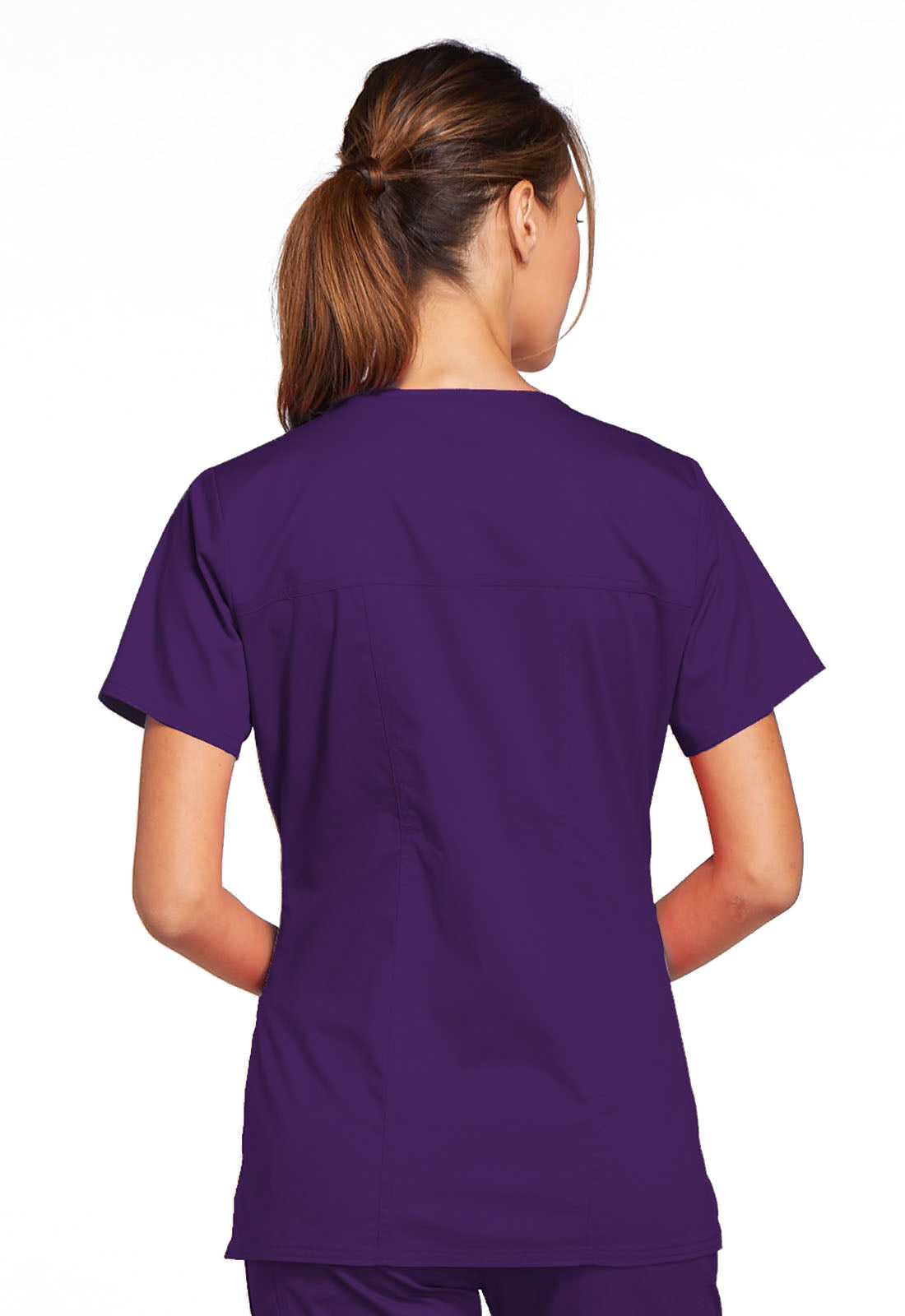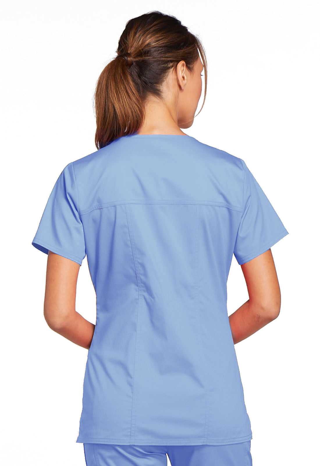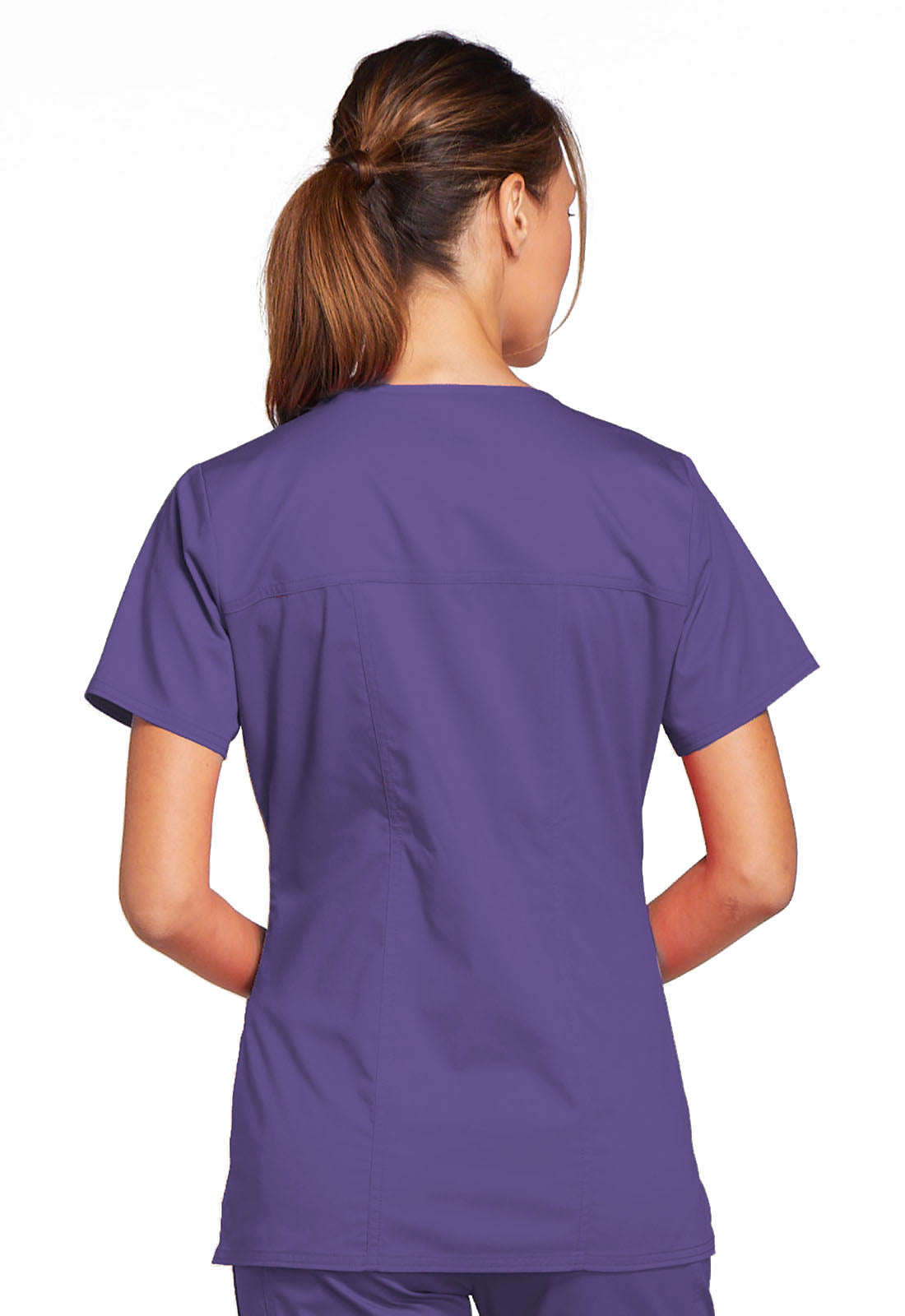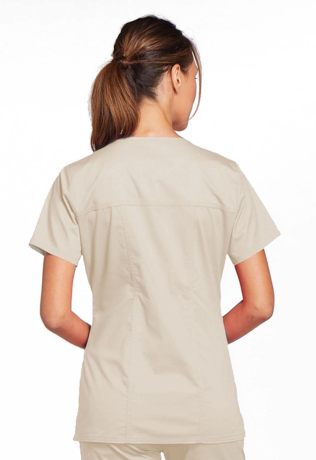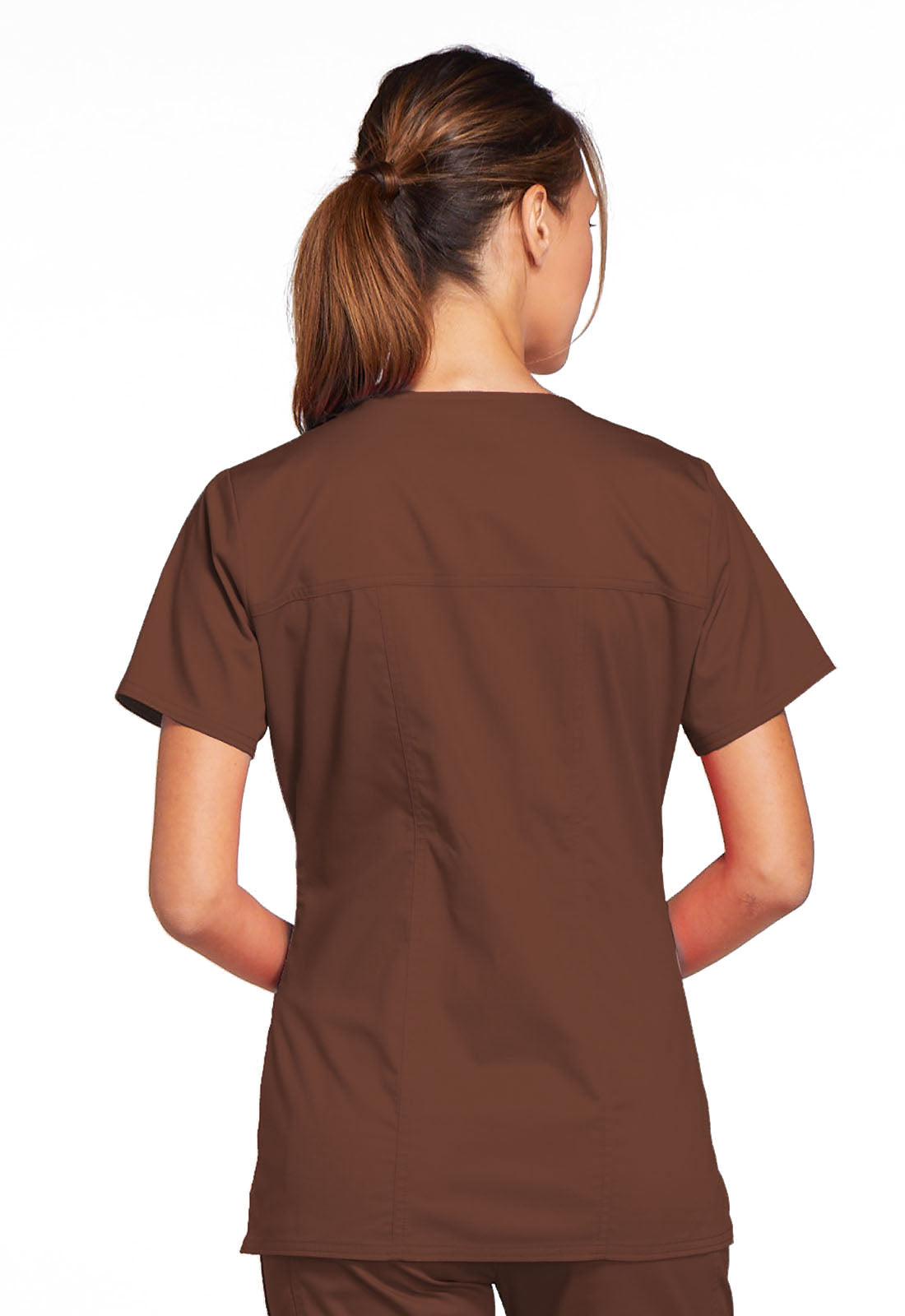 A Modern Classic fit V-neck top features crossover front yokes and patch pockets. The right side pocket has a sectional pocket and I.D. loop. A back yoke, back princess seams and side vents complete the picture. Center back length: 27".