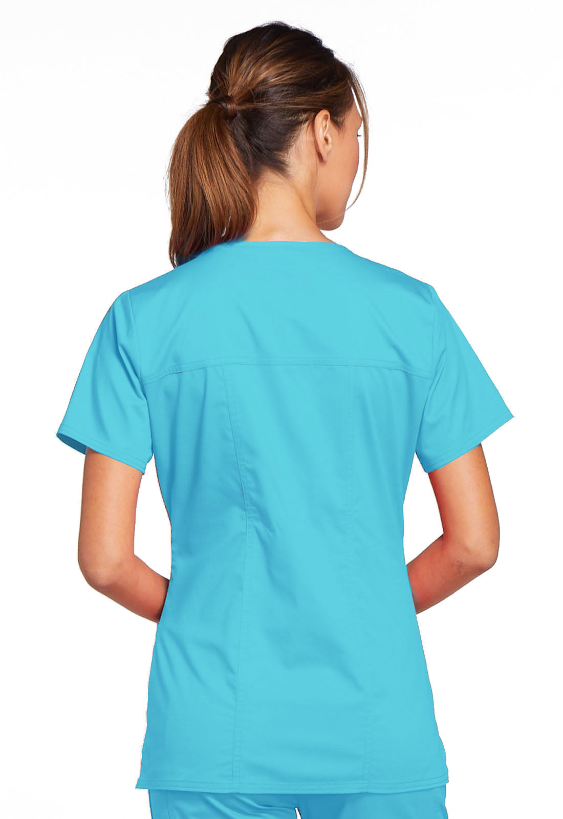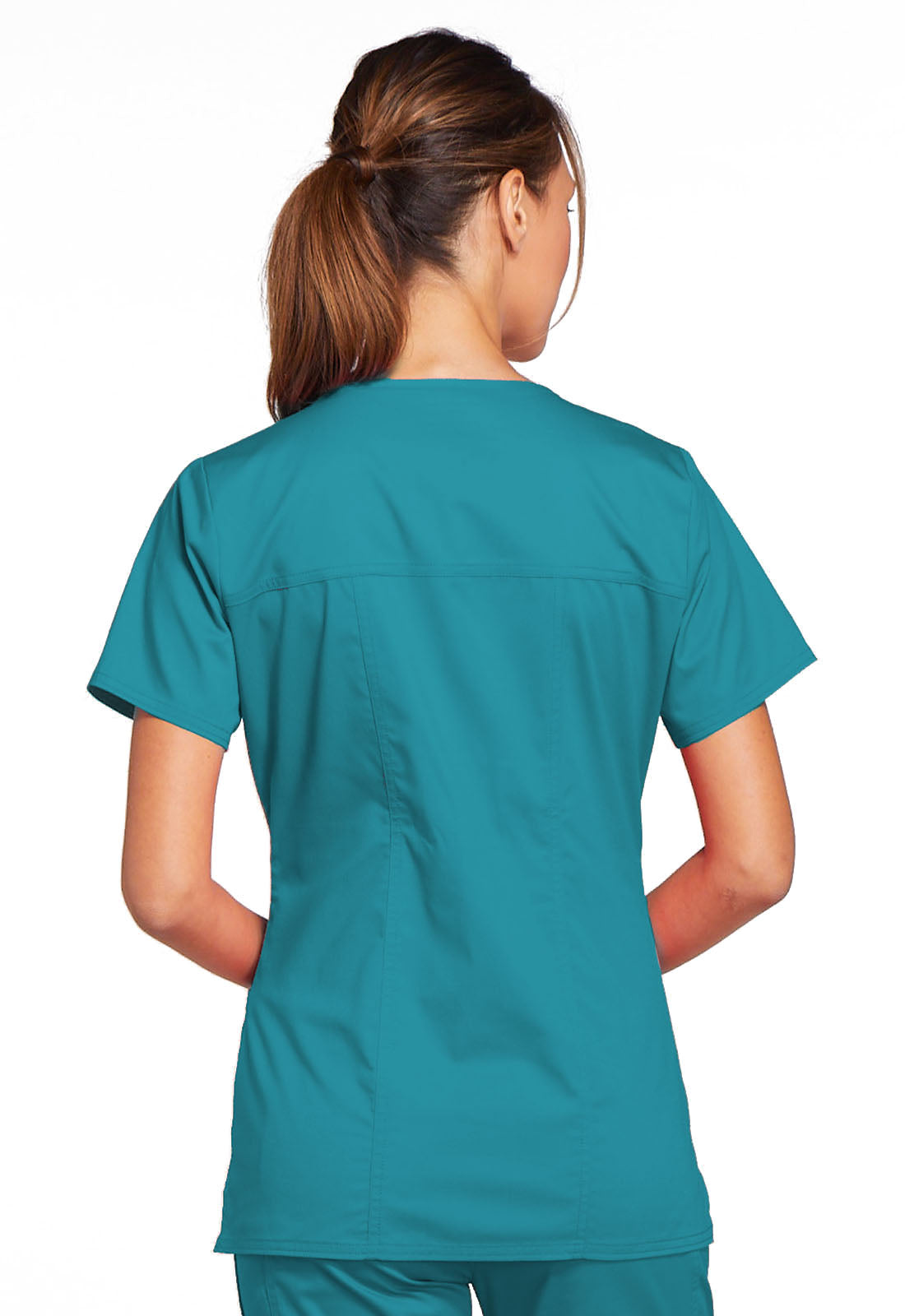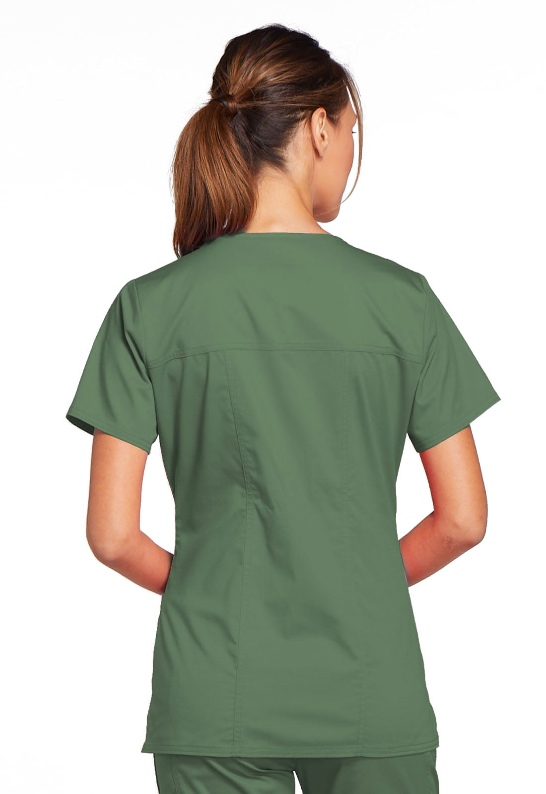 A Modern Classic fit V-neck top features crossover front yokes and patch pockets. The right side pocket has a sectional pocket and I.D. loop. A back yoke, back princess seams and side vents complete the picture. Center back length: 27".