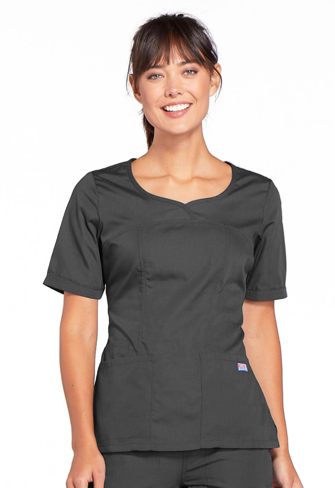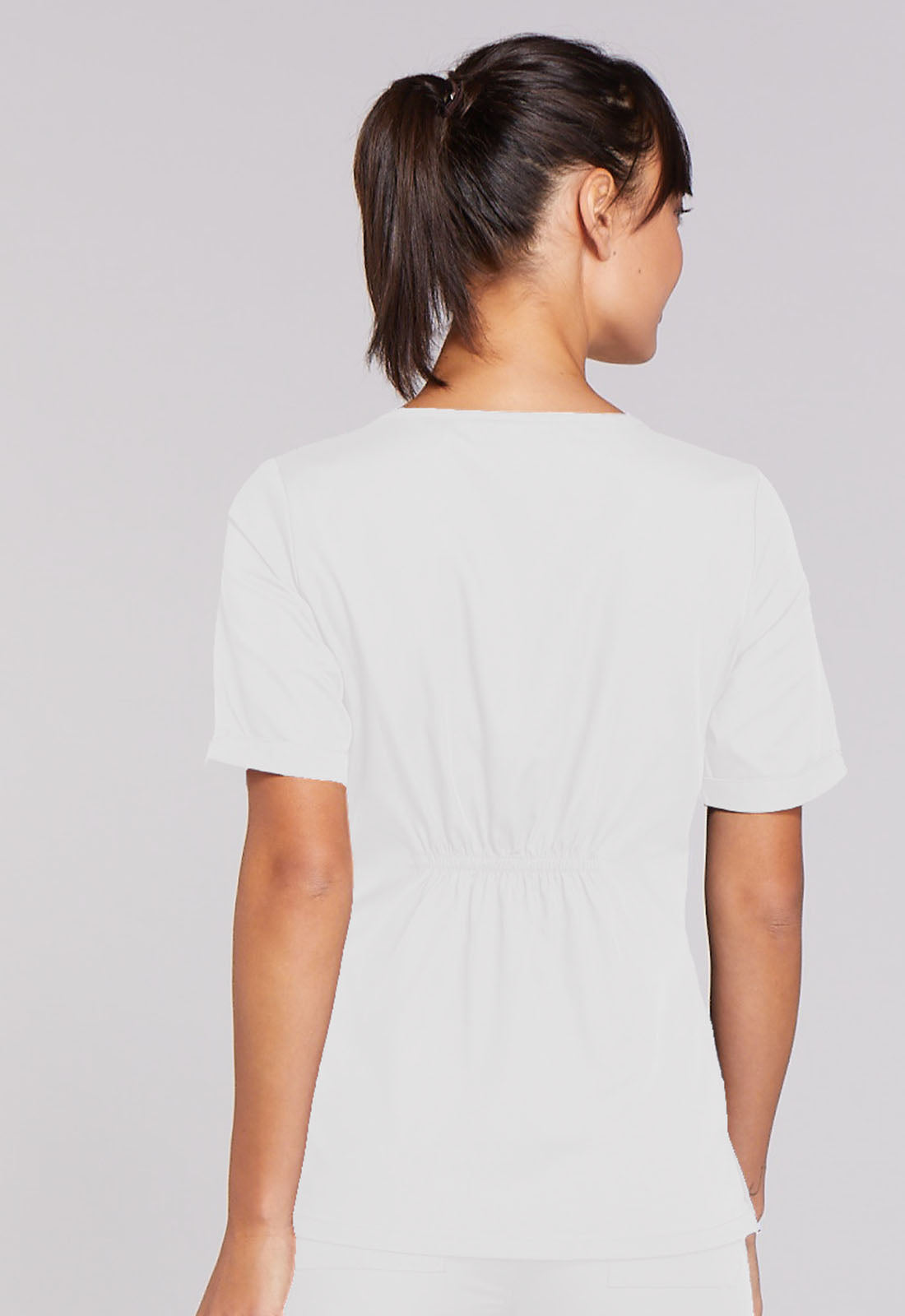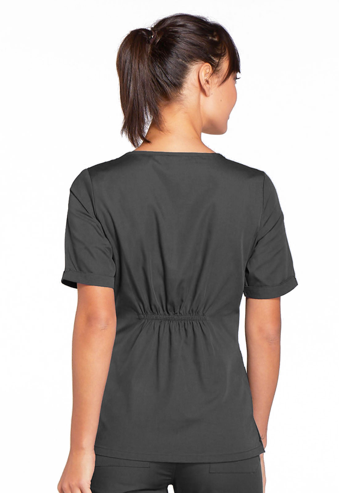 A Modern Classic fit V-neck top features a slightly curved front yoke, front princess seams, front patch pockets, cell phone pocket, above elbow length sleeves with notched turn back cuff, and half back elastic and side vents. Center back length 26"