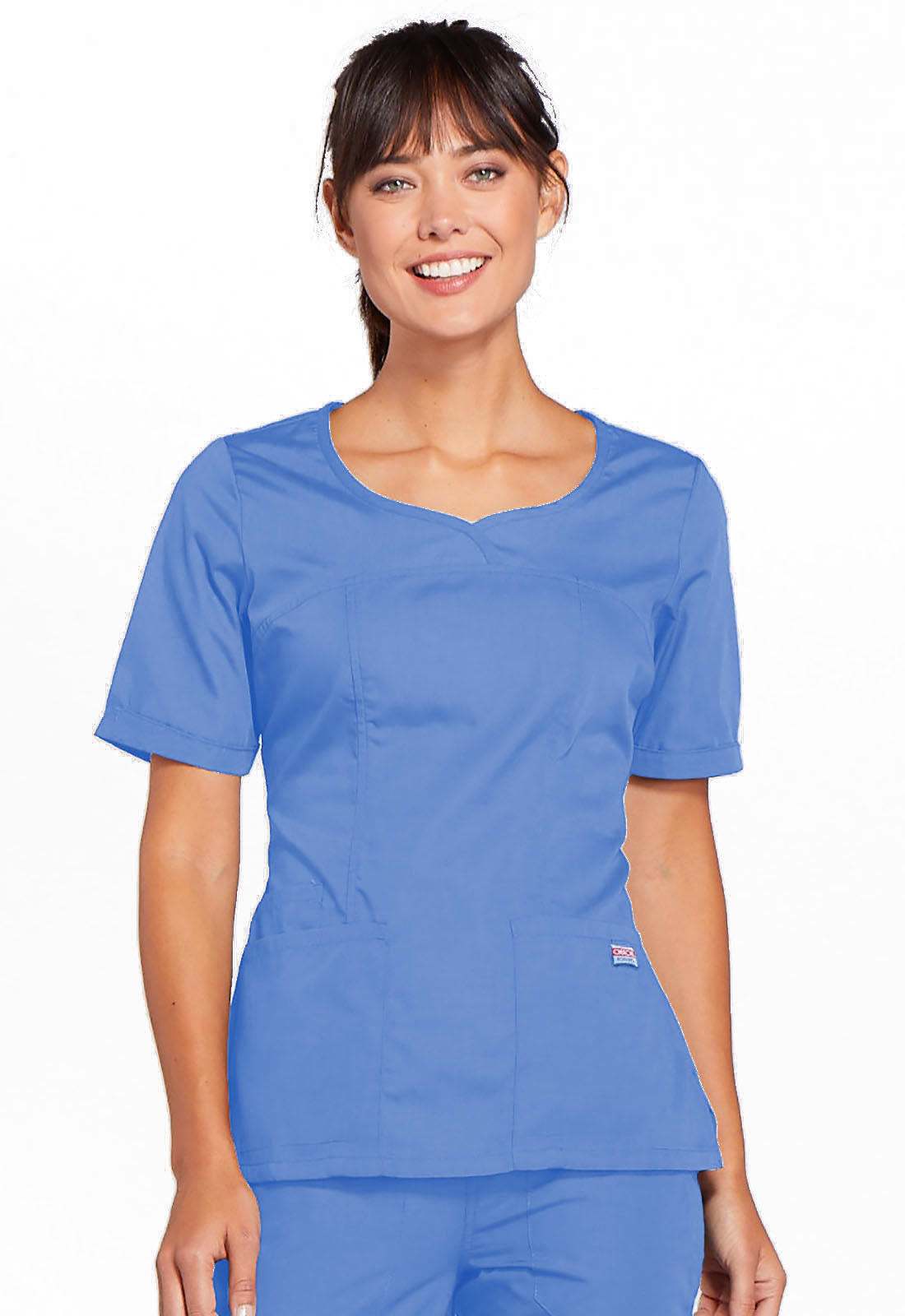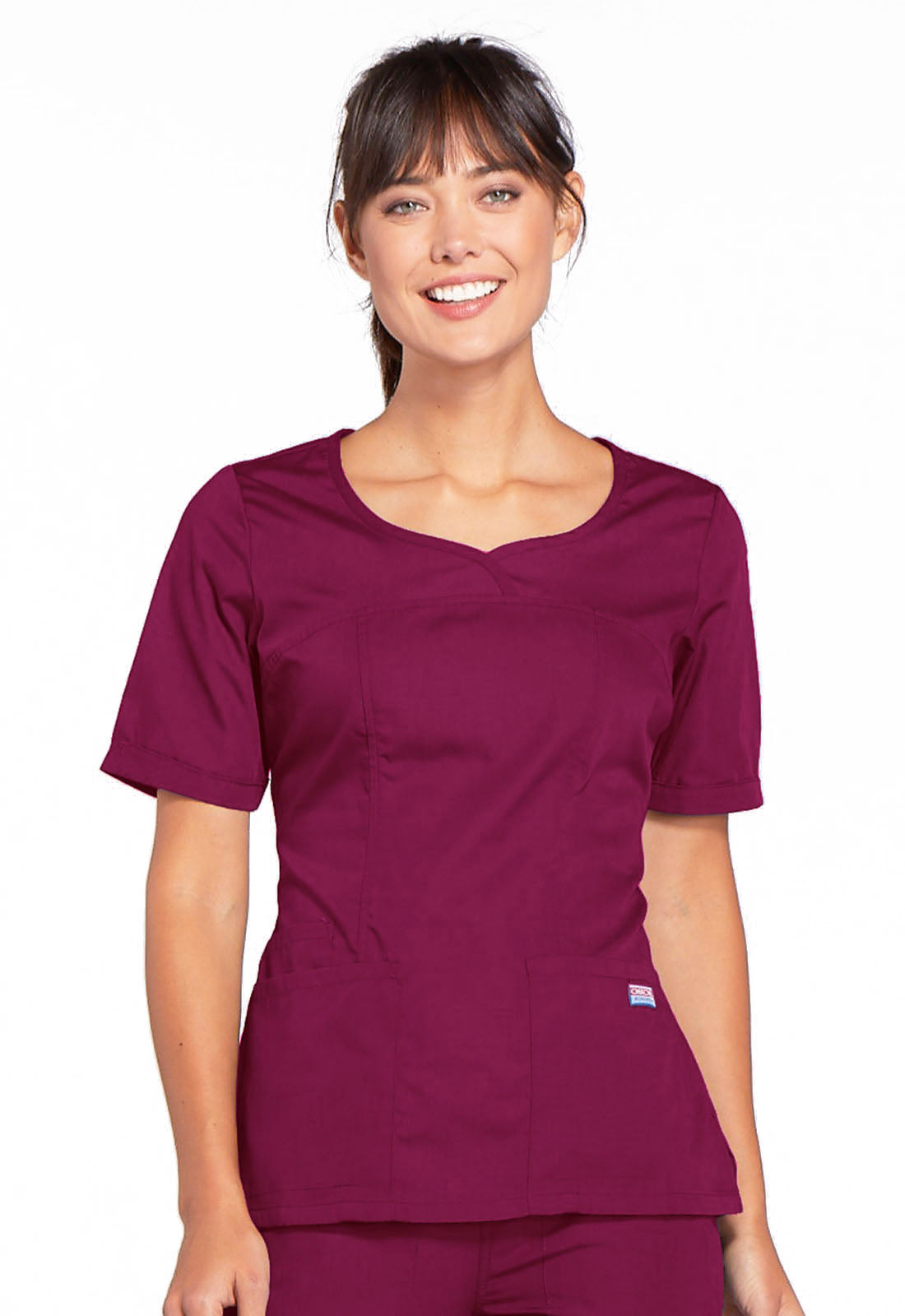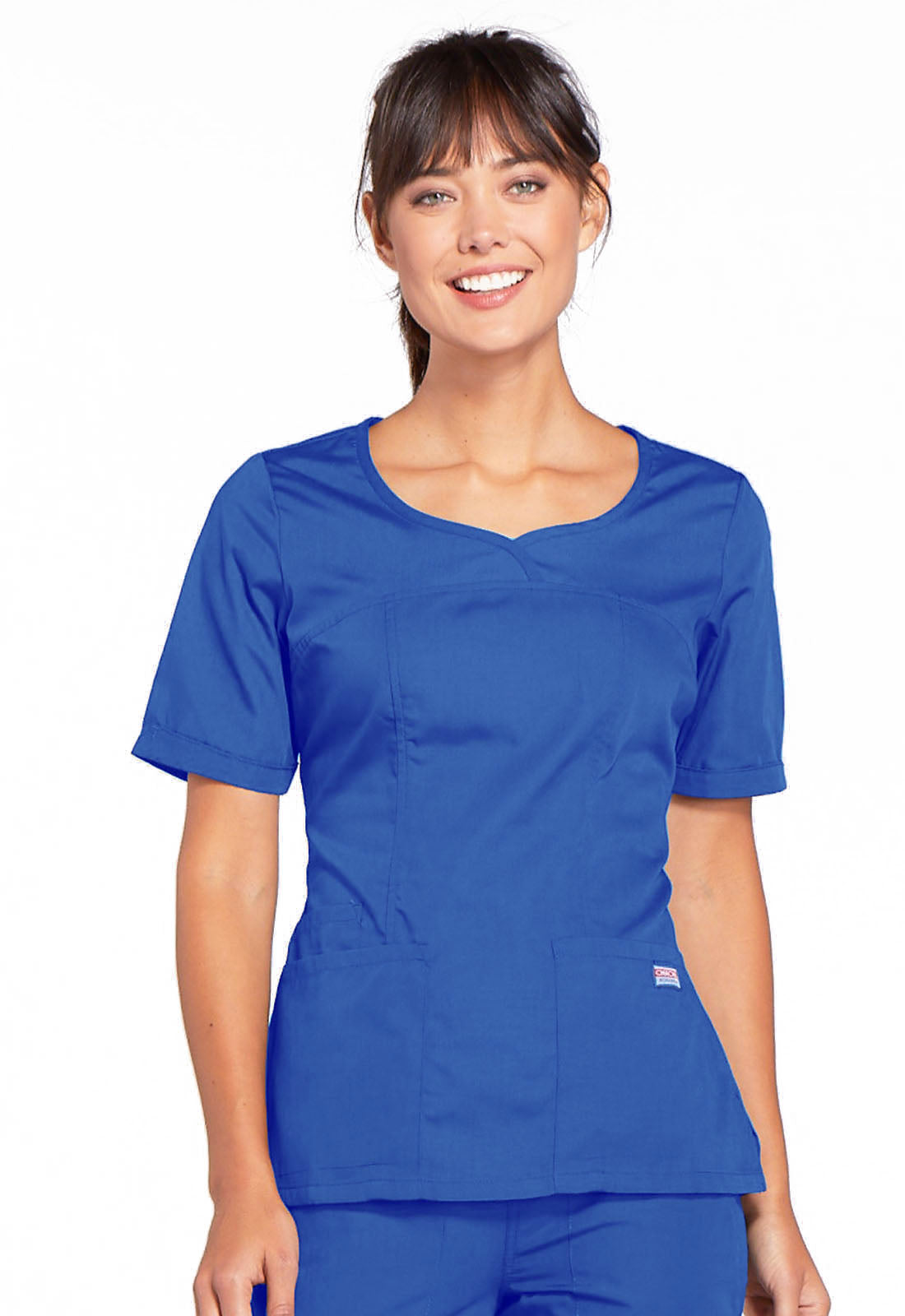 A Modern Classic fit V-neck top features a slightly curved front yoke, front princess seams, front patch pockets, cell phone pocket, above elbow length sleeves with notched turn back cuff, and half back elastic and side vents. Center back length 26"