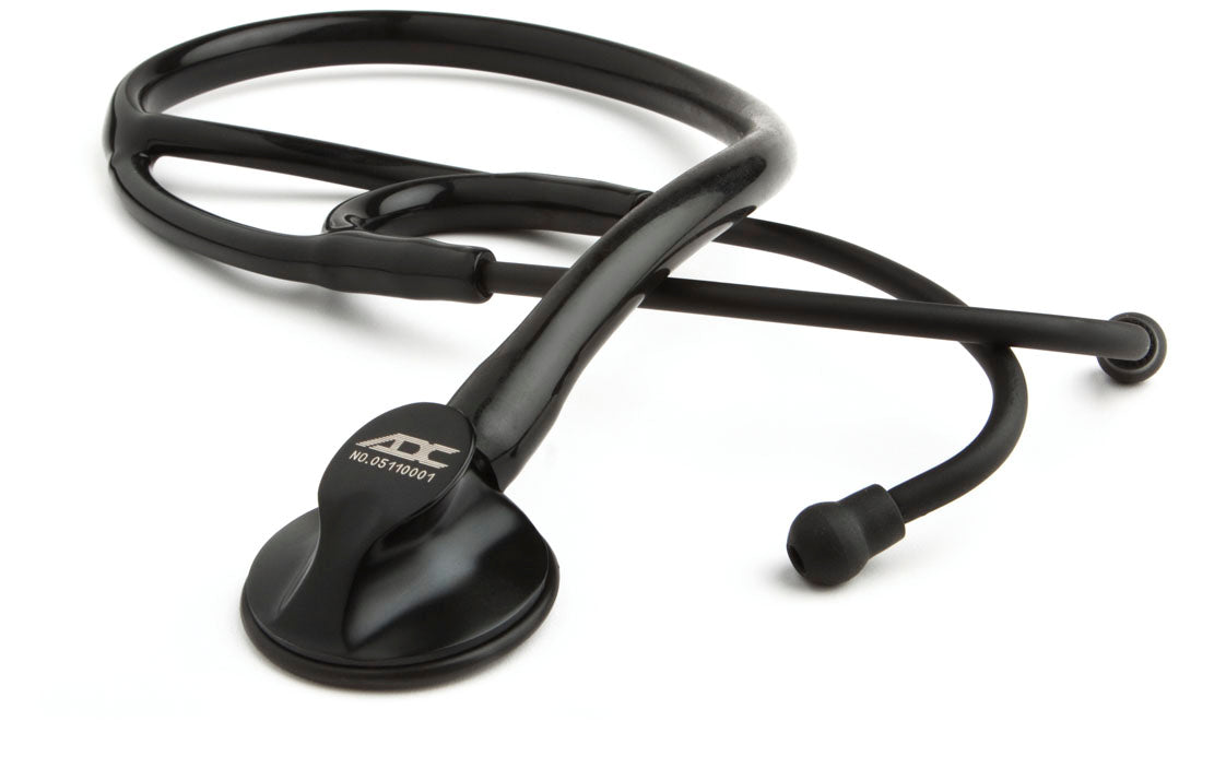 ADC’s adjustable frequency design (AFD) technology for the acoustic response of a traditional bell and diaphragm in a convenient one-sided chestpiece. Light pressure for low, bell-type frequency, firm pressure for high, diaphragm-type frequency. Sculpted chestpiece precisely CNC machined to exacting tolerances from surgical stainless steel for outstanding performance, rugged durability, and impressive ergonomics. Non-chill diaphragm retaining rim for patient comfort. Cardiology headset with large-bore stainless-steel binaurals, fixed at a 15° angle to maximize comfort and acoustic seal. Bi-lumen (dual bore) 19" PVC tubing stays soft and flexible. Adsoft™ Plus snap-on silicone eartips for the ultimate in wearing comfort and acoustic seal. Tactical model uses black anodized aluminum aural tubes. Accessory kit includes additional Adsoft™ Plus eartips and scope ID tag. Weighs 7.15 oz (203 g); weight may vary depending on finish. Overall len