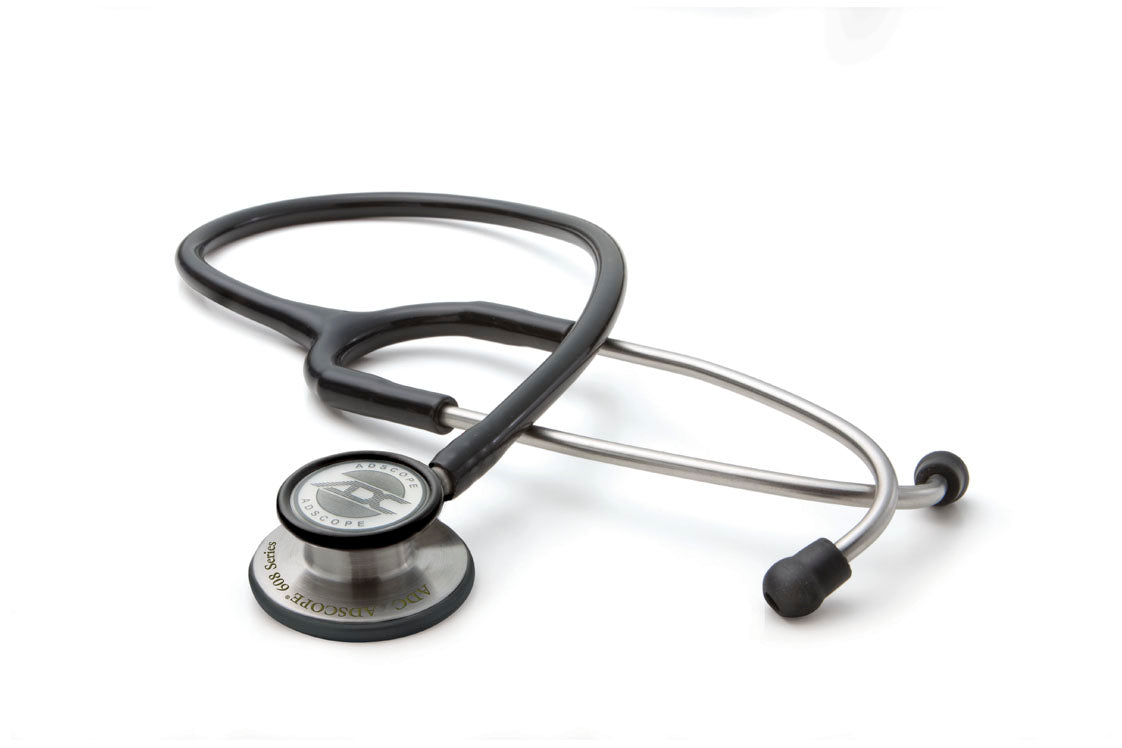 Intruducing the Adscope 608 Convertible Clinician Stethoscope. ADC’s latest addition to the Clinician Series line of stethoscopes is certain to become a practitioner favorite. Combining AFD technology with a convertible design, the ADC Adscope 608 provides adult diaphragm/bell or adult/pediatric diaphragm configurations. Extra-large bell (13/8" diameter) for unsurpassed low-frequency response. Ultra-sensitive diaphragm (13/4" diameter) for amplification and crisper high-frequency response. Adjustable Frequency Design (AFD) technology further enhances acoustic response: use light pressure for low frequencies, firm pressure for high frequencies. Non-chill bell and diaphragm retaining rims for patient comfort. Clinician headset boasts reinforcing yoke molded into flexible 22" PVC tubing and stainless steel binaurals fixed at 15º angle for greater comfort. Adsoft Plus silicone eartips for the ultimate in wearing comfort and acoustic seal. Lifetime warranty covers all parts.