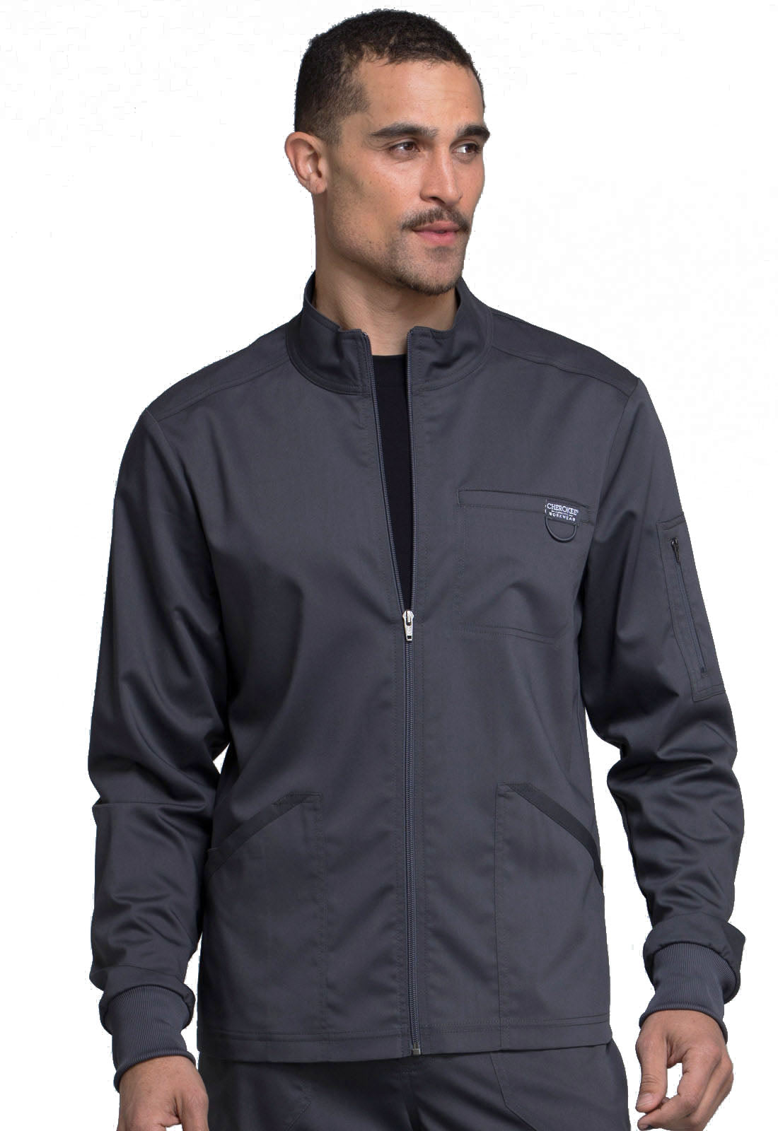 A Men’s zip front warm-up jacket features a chest pocket with logo label and bungee loop, two patch pockets, a cell pocket, and rib-knit cuffs. Also features a sleeve pocket with security zip closure, and back locker loop. Center back length: 27”