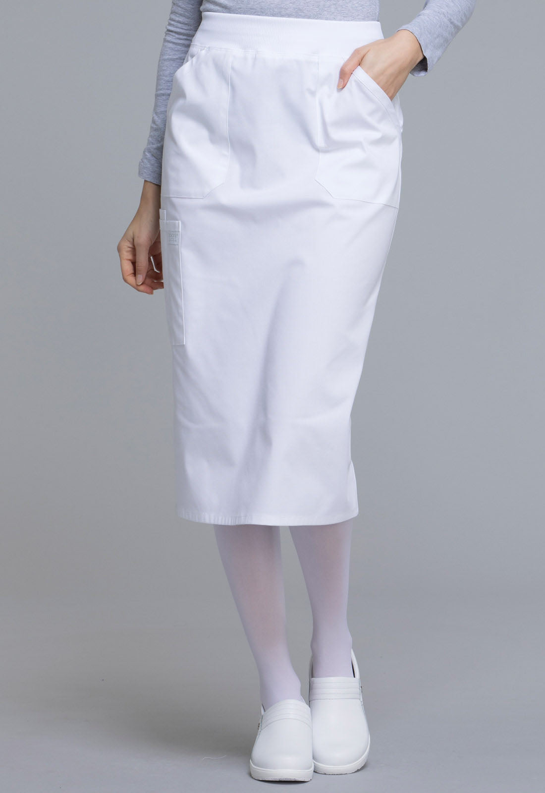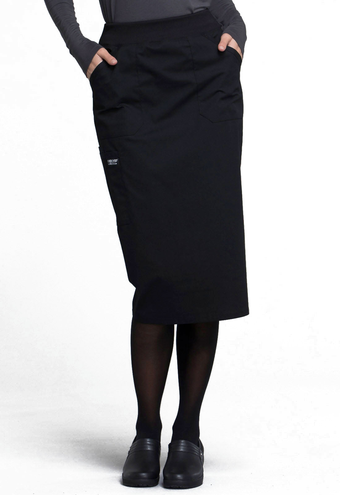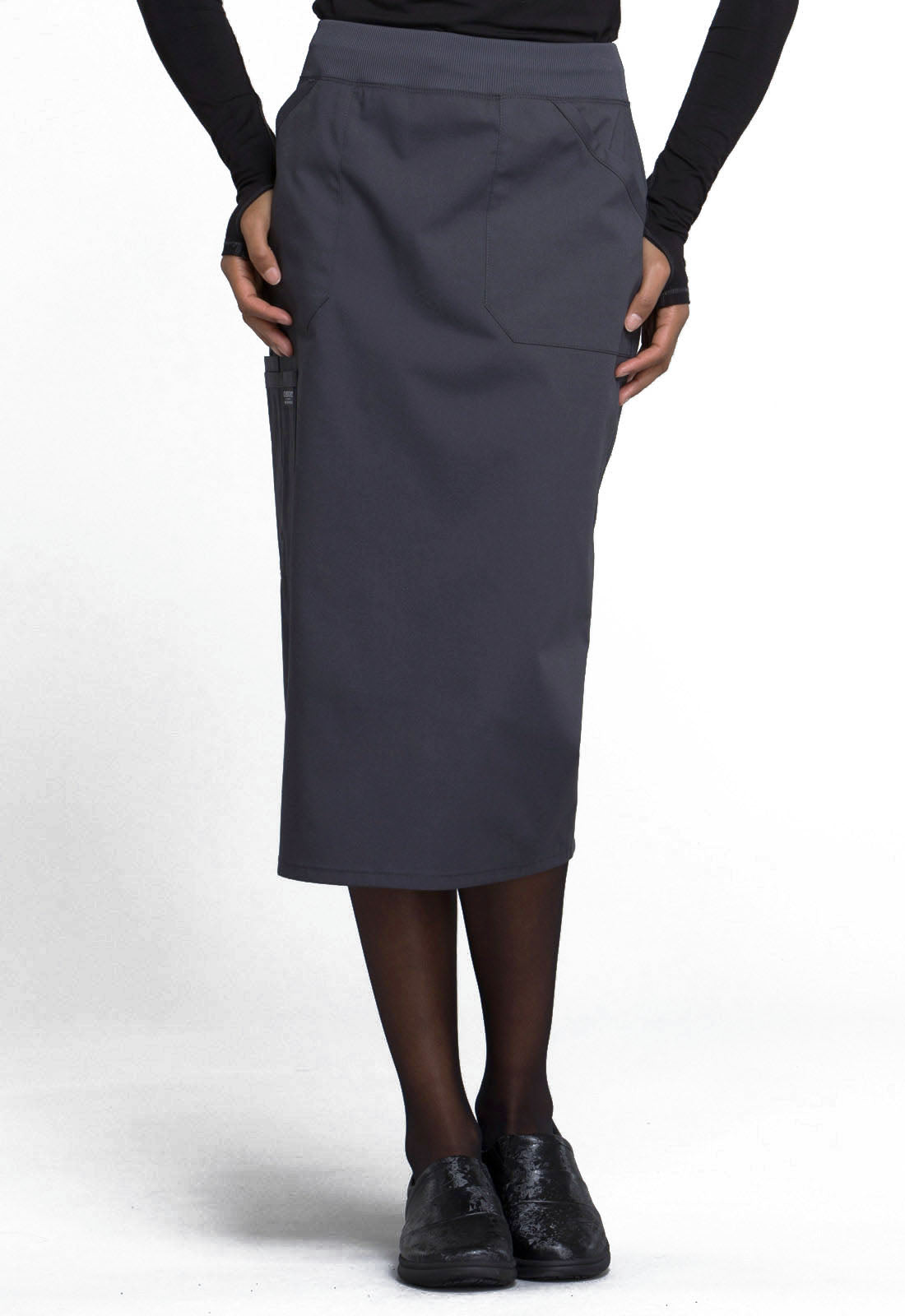 A Modern Classic fit skirt features a comfort-fit rib knit waistband reinforced with inside elastic, front patch pockets, and a large cargo pocket with pen stitch. Also featured are a cell phone pocket and a back vent for easy movement. Center back length: 30”