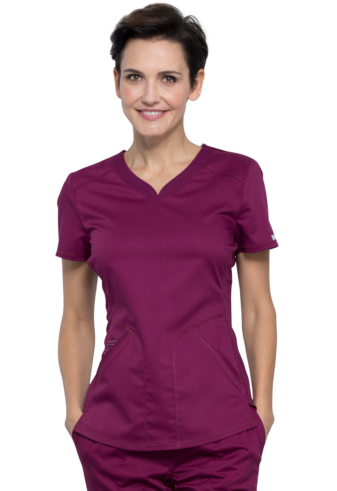 Add a sporty twist to your medical wardrobe with this soft shaped V-neck top with two patch pockets and instrument loops. A breathable mesh is featured on the neckband and side panels for extra comfort and mobility. Modern Classic fit. Center back length: 26"