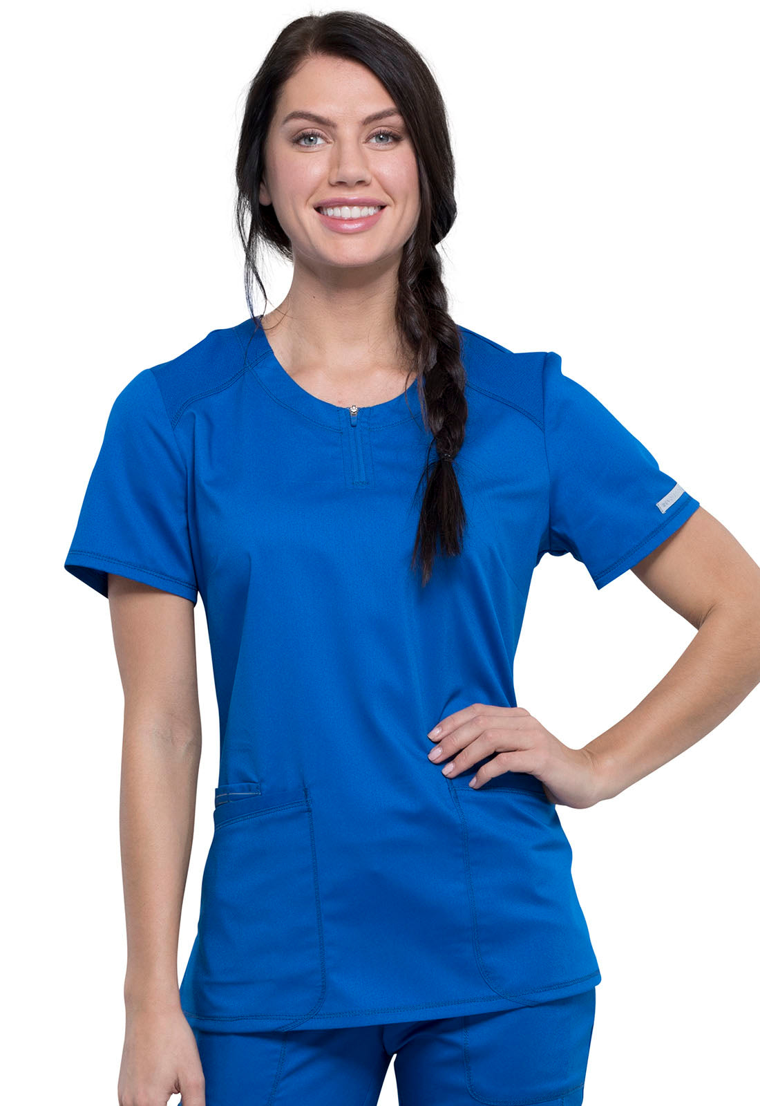 This front zip round neck top features a breathable mesh at the front shoulder panels and back princess panels, for extra comfort and mobility. Also featured are two front patch pockets, one cell pocket with reflective instrument loop and side vents for a flattering fit. Modern Classic fit. Center back length: 26"