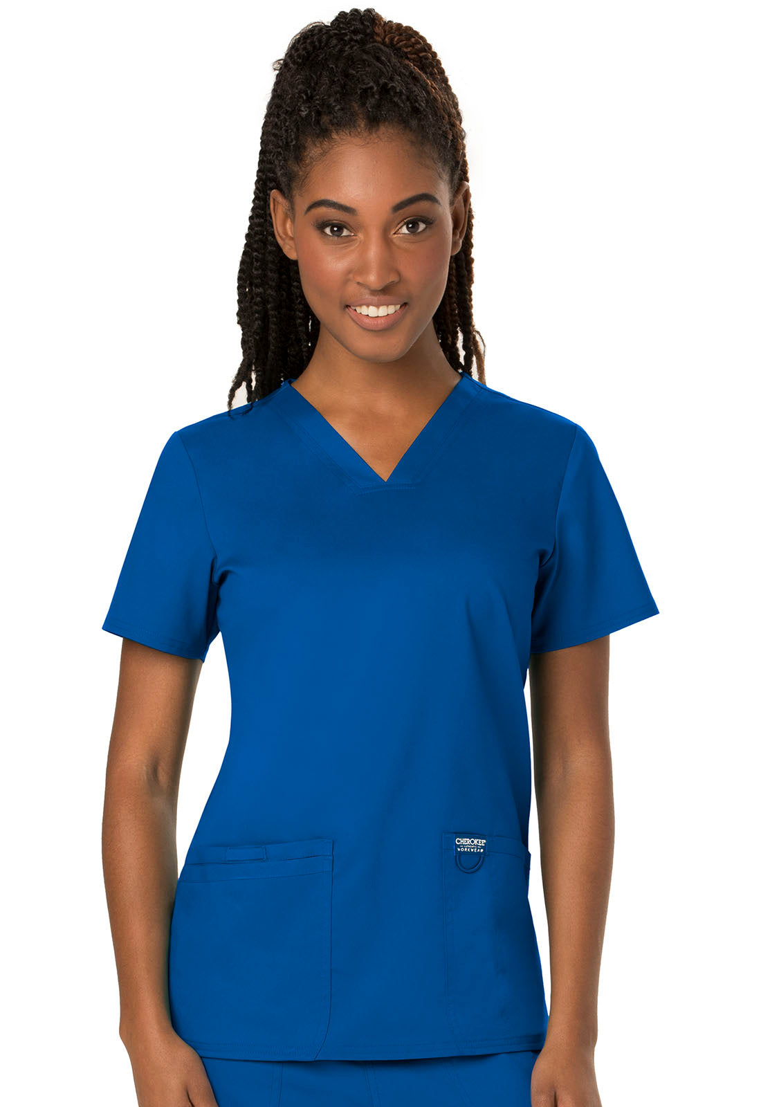 A Modern Classic fit V-neck top features patch pockets, an instrument loop, pencil stitch, logo label with bungee loop, back princess seams, and side vents. Center back length: 27”