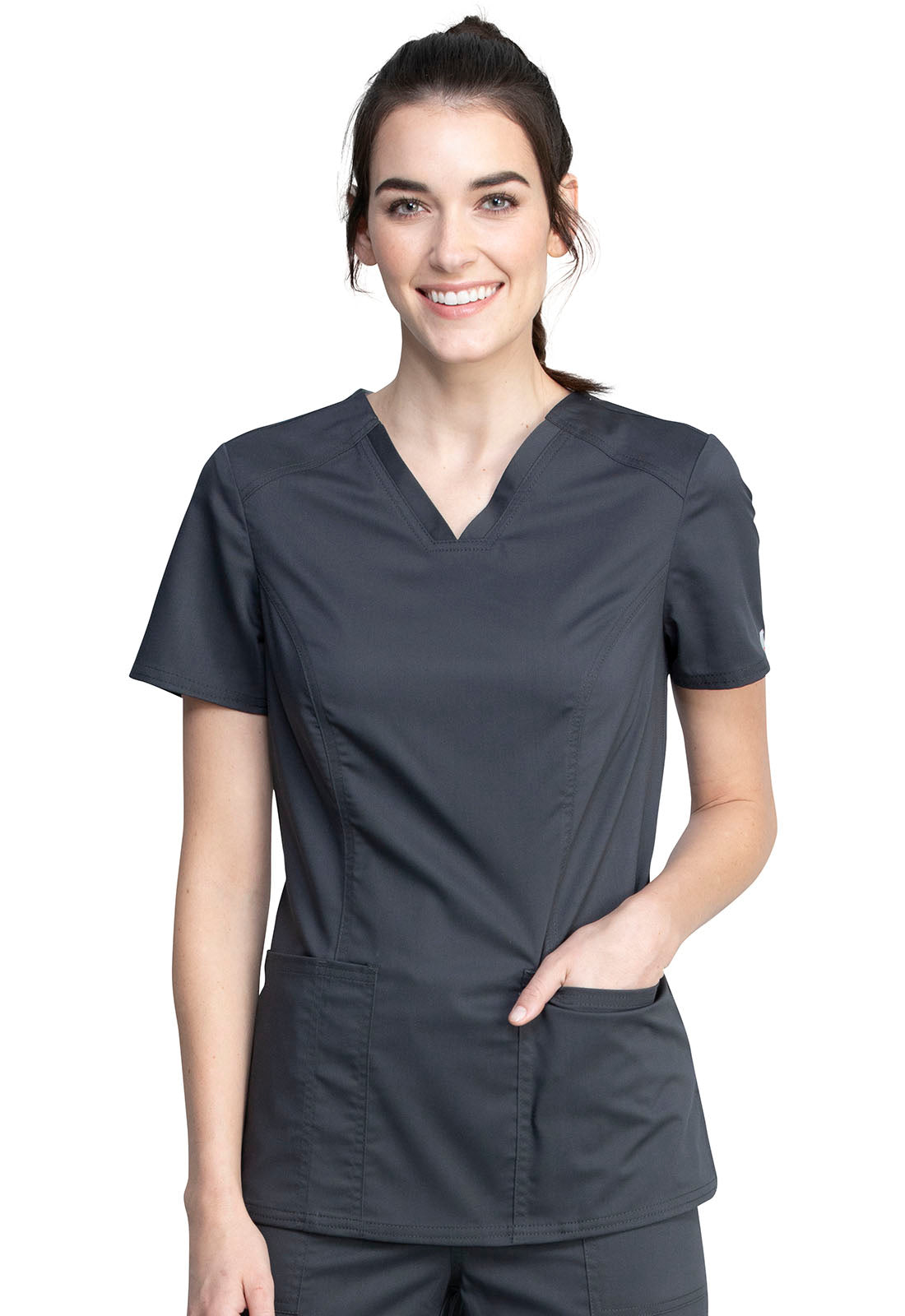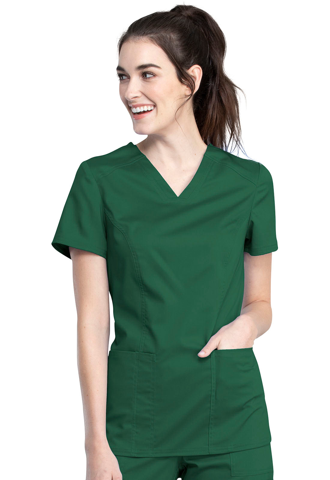 This Modern Classic fit, V-neck top, features front and back yoke seams and front princess seams. Also included are two roomy patch pockets, the right pocket with a convenient pencil stitch, and side vents. Center back length: 26"