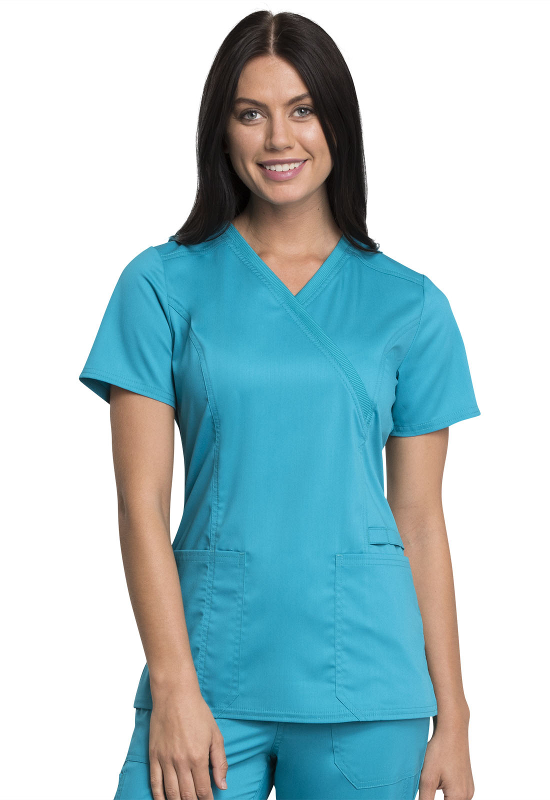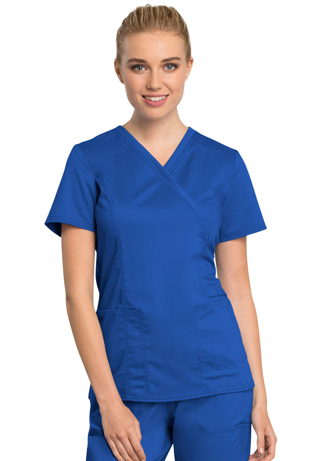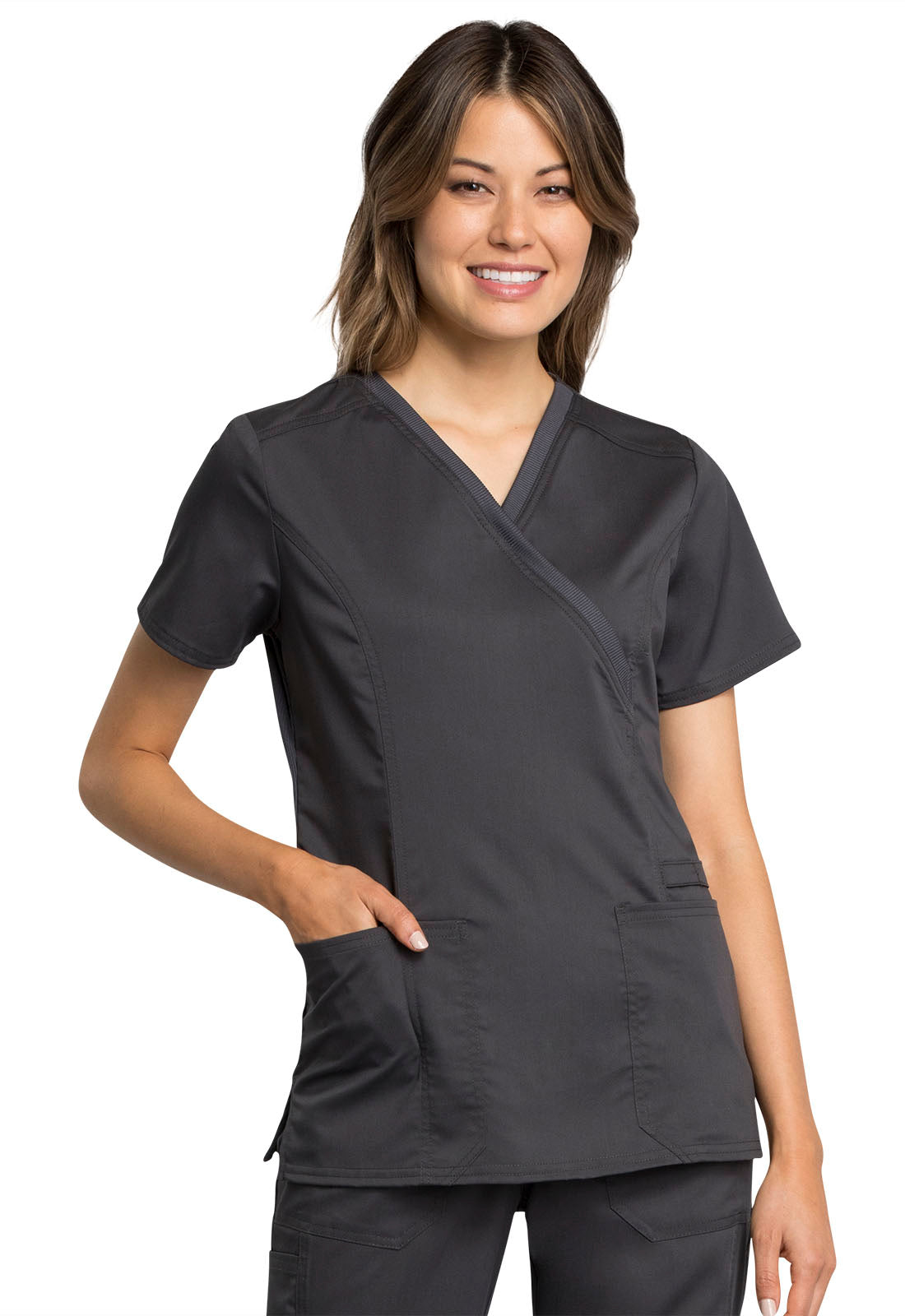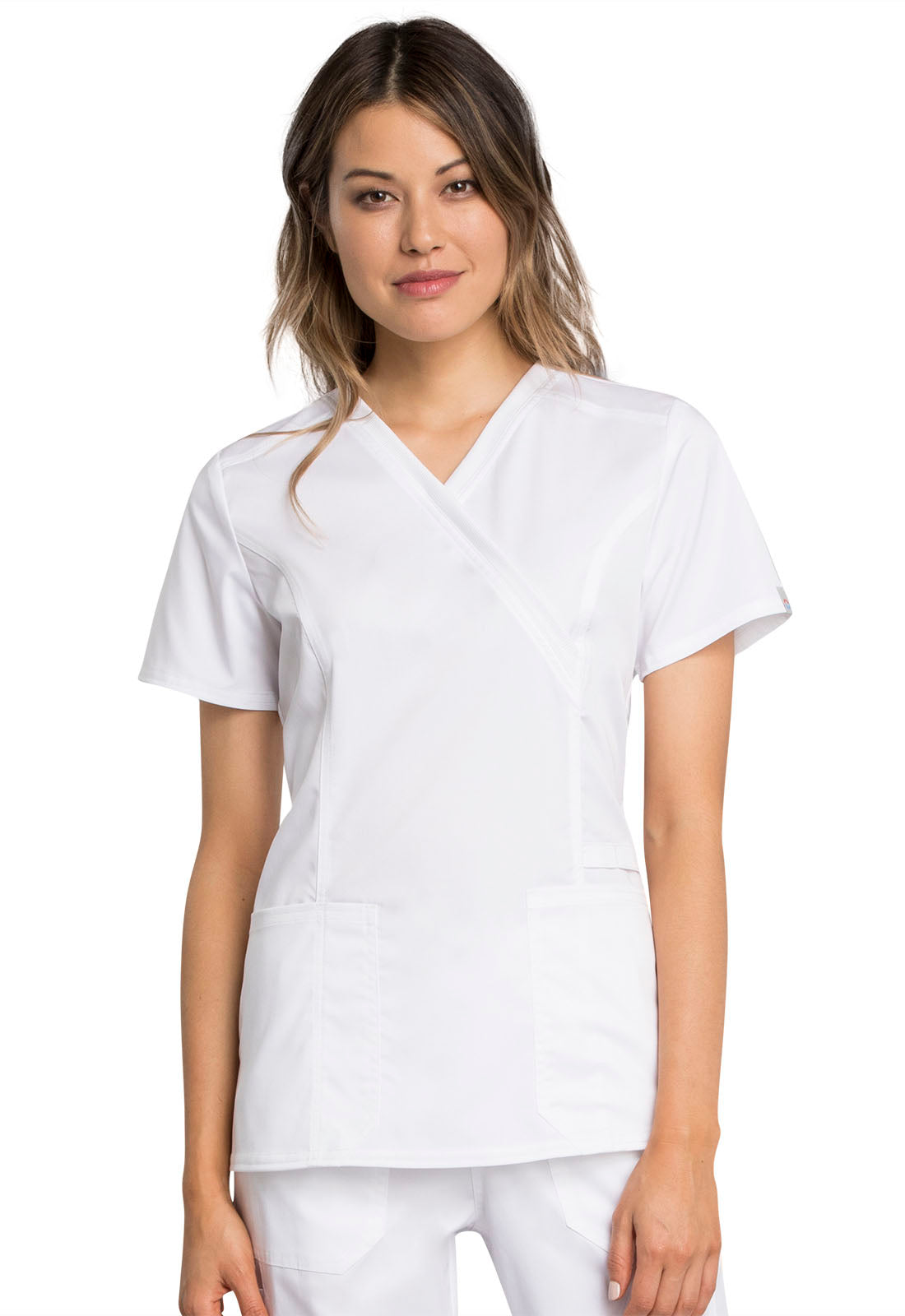 This short sleeve top features on-trend mock wrap styling, princess seaming at the front for a flattering shape, and rib knit panels at the back for added comfort. Instrument loops and two large patch pockets at the front provide ample room for storage. Modern Classic fit. Center back length: 26"